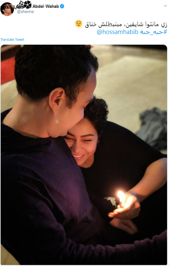 شيرين تعمدت الظهور بملابس المنزل ودون مكياج تقريبا للرد على الشائعة، ونشرت الصور عبر حسابها الوحيد على موقع تويتر وعلقت عليها قائلة: زي مانتوا شايفين، مبنبطلش خناق، واستخدمت هاشتاق حبه جنة إشارة للكليب الذي جمعهما.