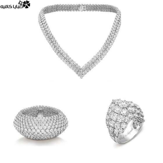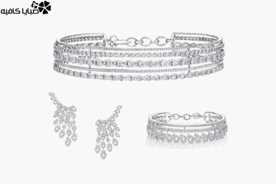 وصُمم العقد من الألماس على شكل دائري أنيق ومذهل بوزن إجمالي ٢٣.٠٢ قيراطاً، وجاءت الإسورة مرصعة بالألماس من الذهب الأبيض لإضاءة المعصم مع الألماس المصقول بالزمرد، مع أحجار الألماس المستدير، وصُممت الأقراط المتسلقة المصنوعة من الذهب الأبيض، بدقة لتسلق الأذن، بوزن إجمالي ١٠.٤٠ قيراطاً من قطع الألماس المستدير